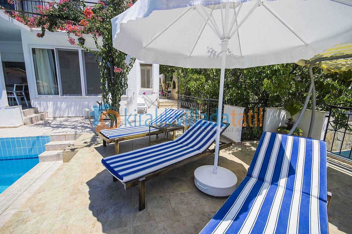 Verandasında ve şark köşesinde keyifli anlar yaşayabilir, manzaranın tadını çıkartabilirsiniz. Villa çevresi genellikle yeşilliklerle kapalı olduğundan meraklı gözlerden uzak bir tatil geçirme imkanına sahipsiniz. Havuz önündeki demir korkulukların üzerleri kumaş ile kapatılmıştır. Villamızın solundaki binada villaya bakan pencere bulunmamaktadır. Sağ tarafı ise yeşillikler ile hemen hemen kapanmış durumdadır. Villamıza ayrıca 8 kişilik bir yemek masası da eklenmiştir.