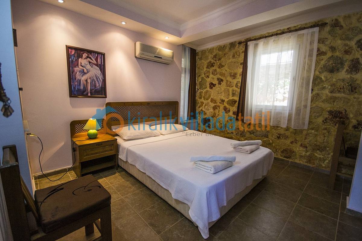 Kalamar bölgesinin sessiz sakin elit bir bölgesinde olan villamız, muhteşem Kalamar Koyu manzarasına hakimdir. Villamız eski taş yapıya sahip olduğundan, genelde serin olmaktadır. Bundan dolayı oturma odaları ve tek kişilik yatakların bulunduğu odalarda klima mevcut değildir. Sadece çift kişilik yatak odalarında klima mevcuttur. Sokak katında bir araçlık kapalı otopark bulunmaktadır. Sokaktan yaklaşık 20-25 basamaklık merdiven ile binaya çıkış yapılır. İkinci kat binamızın arka tarafından ayrı basamaklarla çıkışı olan bağımsız bir bölümdür. Burada da bir çift kişilik yatak ve 2 adet tek kişilik yatak bulunmaktadır. 2 ayrı ailenin bağımsız olarak konaklayabileceği şekildedir. Yukarı katta küçük bir TV’nin bulunduğu oturma odası, teras balkonu ve küçük bir mutfakta mevcuttur. Villamızda her katta ortak kullanım olarak toplam 2 banyo-wc bulunmaktadır. Süit (banyolu) yatak odası yoktur.