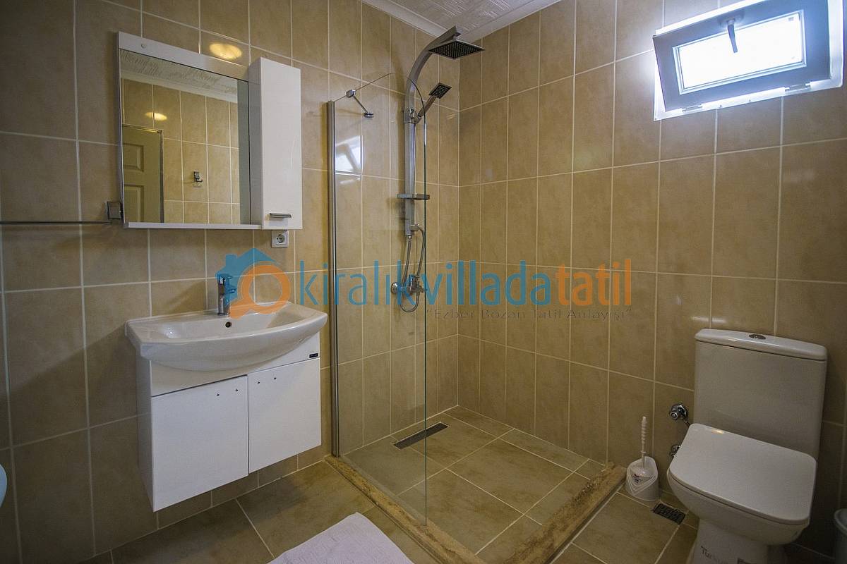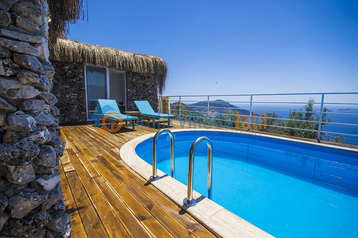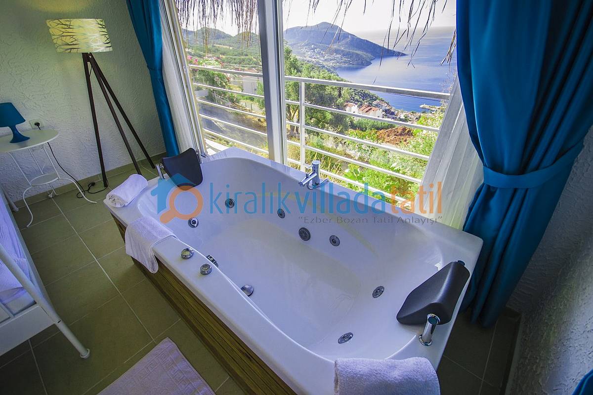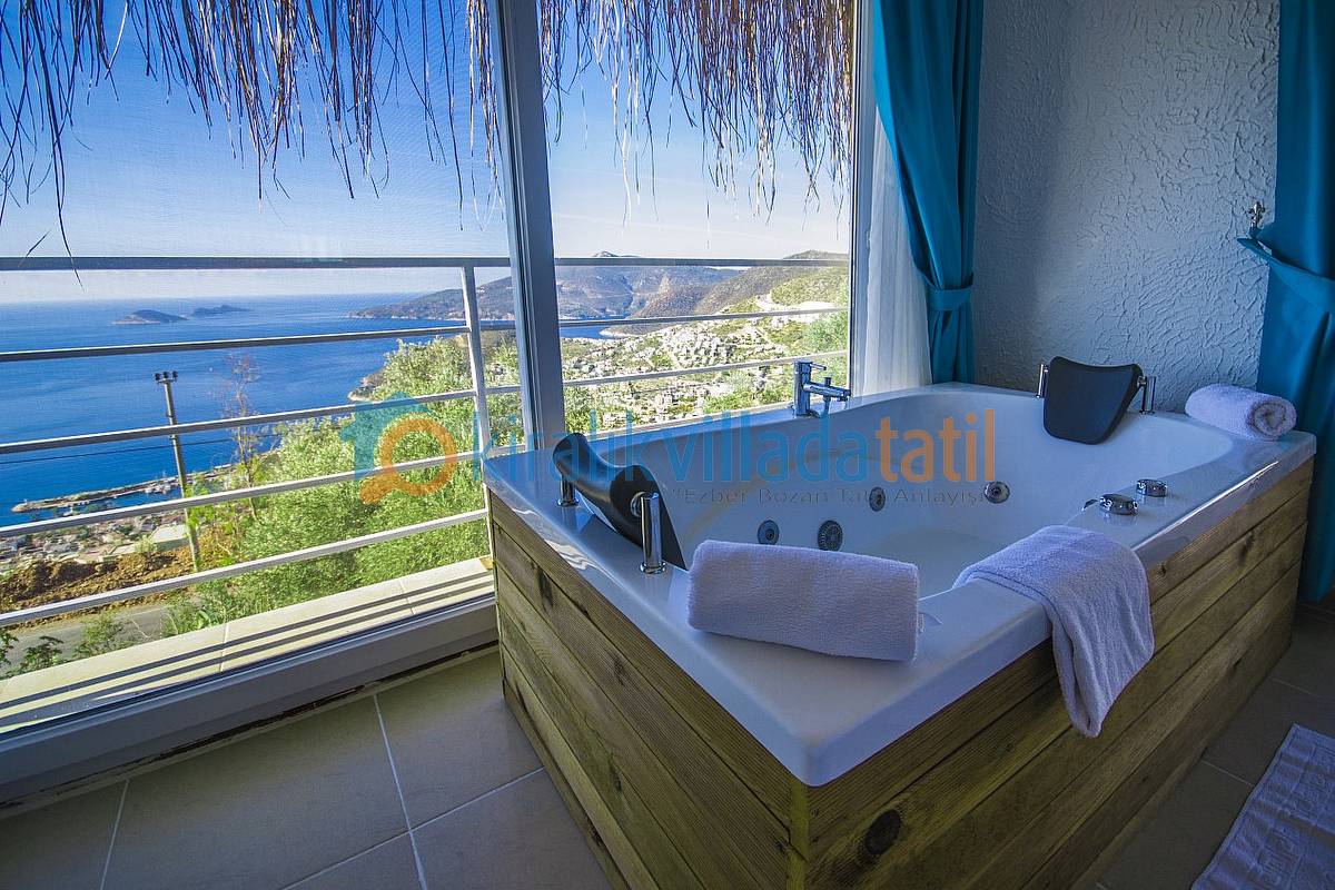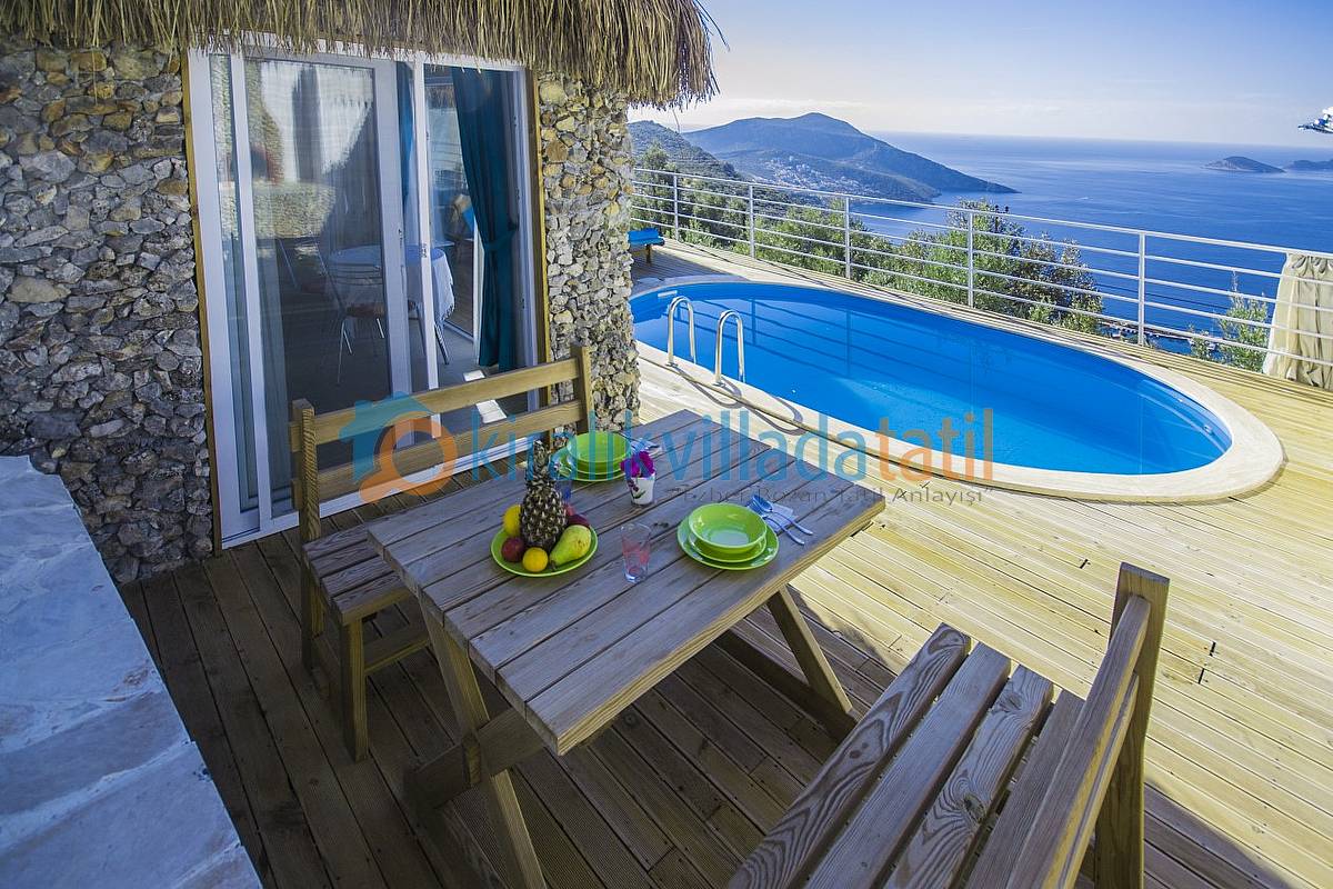 Demir, ahşap ve taş yapısı ile estetik bir görünüme sahip villamıza, aracınızı otoparkta bıraktıktan sonra yaklaşık 40-50 basamaktan oluşan yeşiller içinde manzaralı bir patika-merdiven yoldan çıkış yapılacaktır. Dolayısı ile yaşlı-engelli misafirlerimiz için pek uygun bir villa değildir. (Resimlerde örnek yol gösterilmiştir.) Villamızın bütün odaları ve havuz terası muhteşem Kalkan koyu manzarasına bakmaktadır.