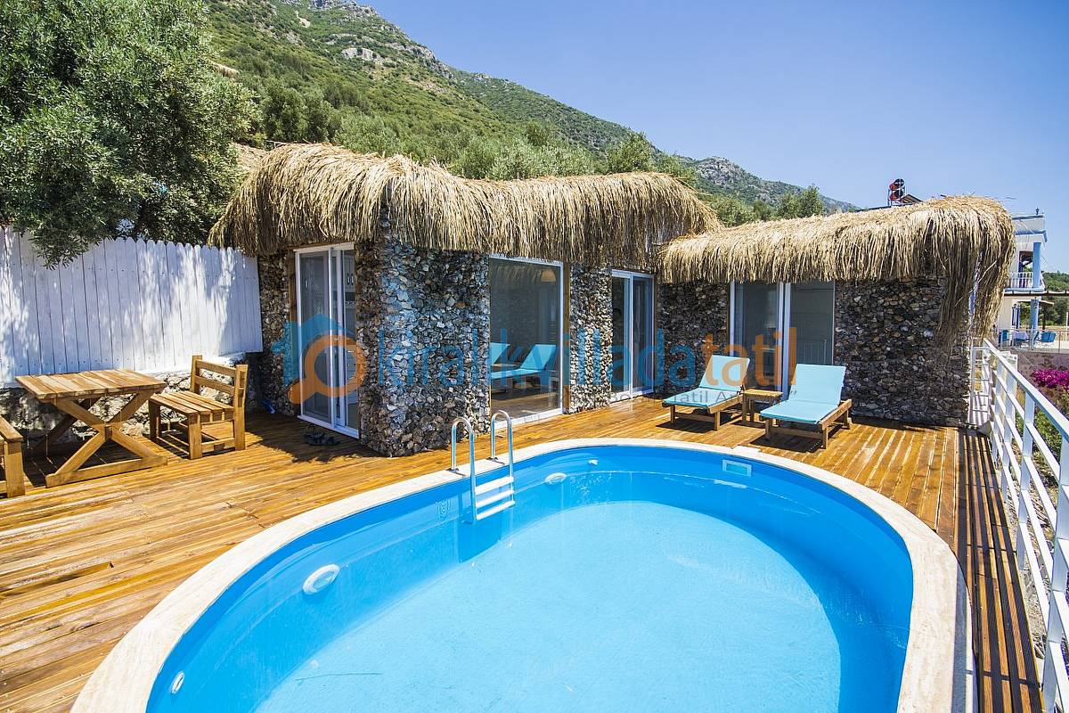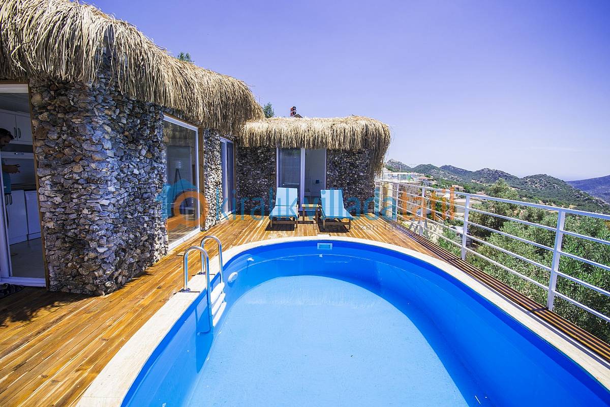 Villanın her yerinden bu manzarayı görebilirsiniz. Ayrıca yatak odasında bulunacak olan jakuzimiz de manzarayı görecek şekilde cam önüne yerleştirilecektir. Havuz ebatlarımız 5 metre x 3 metre olup derinlik 1,50 metredir. Havuz terasında 4 kişilik masa, 2 adet şezlong, şemsiye, duş ve taştan barbeküsü olacaktır. Villa içinde küçük bir Amerikan mutfak-bar, ofis tipi buzdolabı, bulaşık makinası, ocak ve çamaşır makinası yer alacaktır.