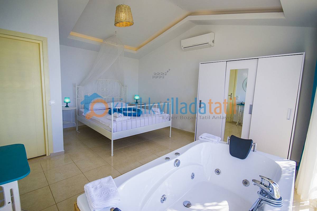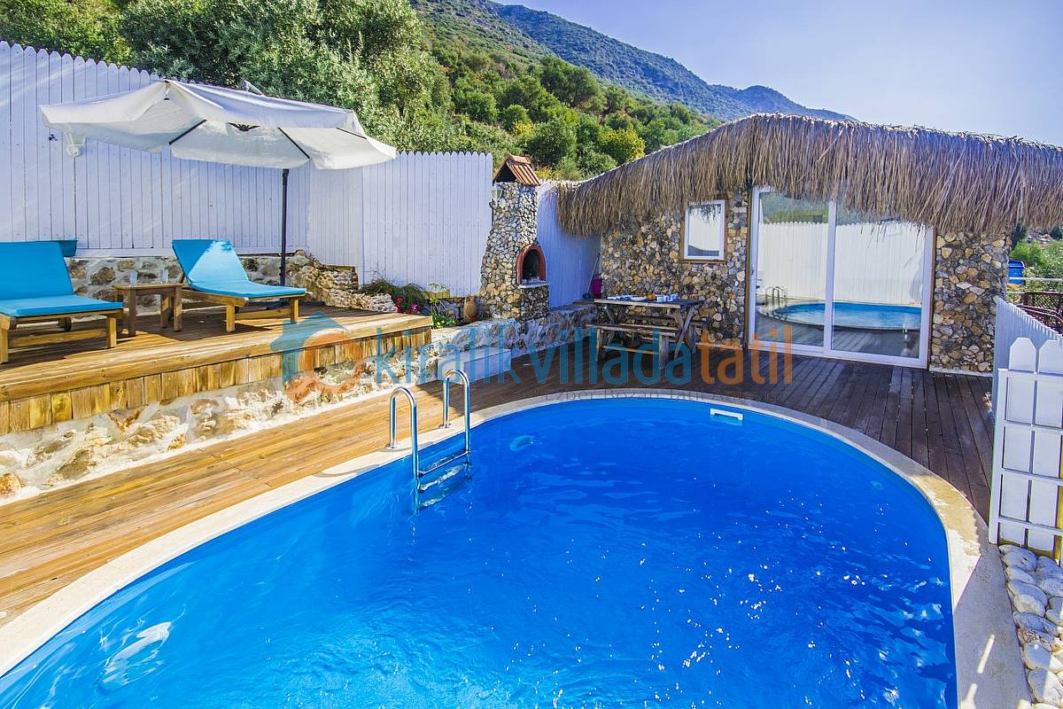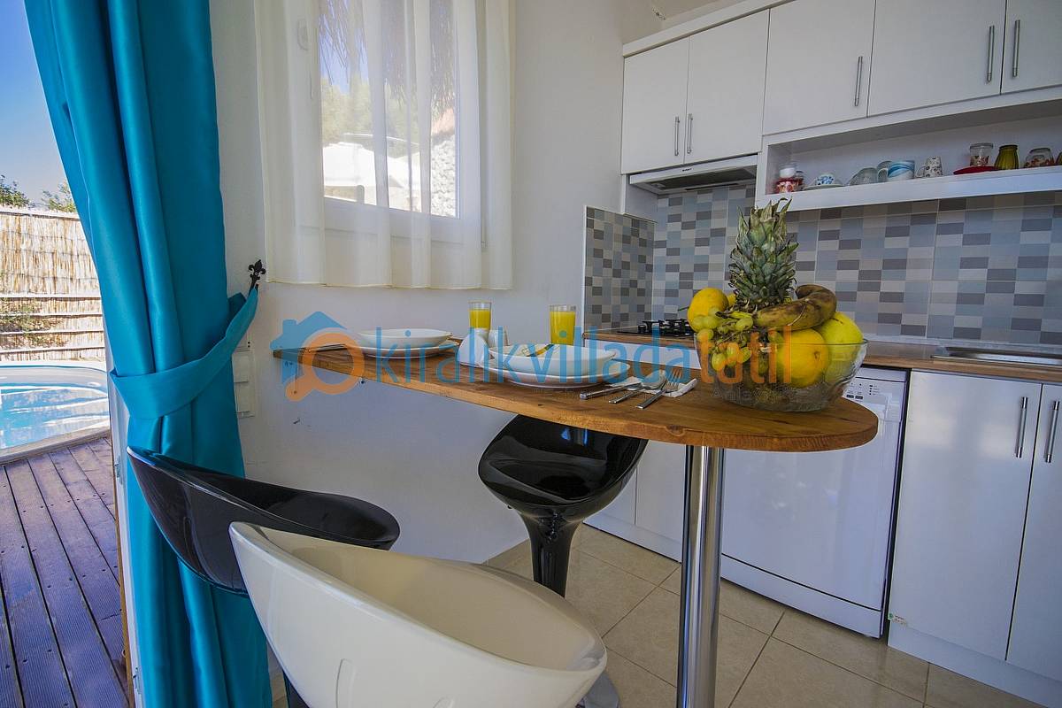 Havuz ebatlarımız 5 metre x 3 metre olup derinlik 1,50 metredir. Havuz terasında 4 kişilik masa, 3 adet şezlong, şemsiye, duş ve taştan barbeküsü bulunmaktadır. Villa içinde küçük bir Amerikan mutfak-bar, ofis tipi buzdolabı, bulaşık makinası, ocak ve çamaşır makinası yer almaktadır. Oturma odası; bir köşe kanepe, sehpa ve LCD Tv’den oluşmaktadır. İnternet bağlantısı ortak olarak sağlanacaktır. Yatak odalarında çift kişilik yatak, 2 komidin, elbise dolabı, makyaj masası ve jakuzi bulunmaktadır.