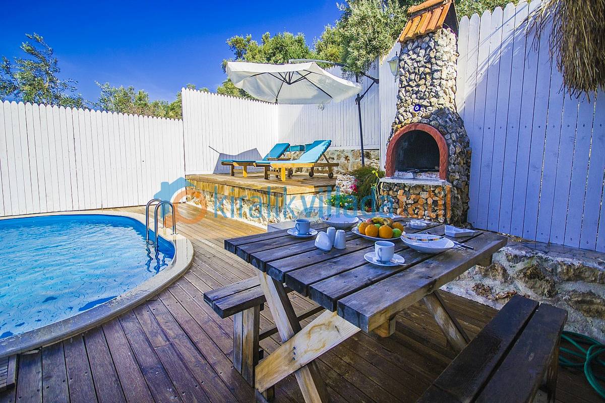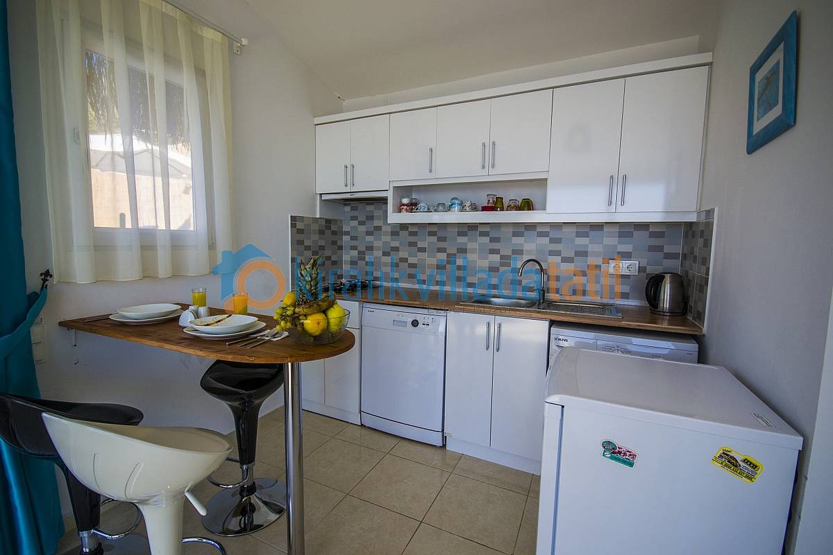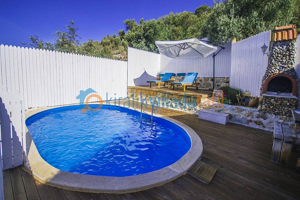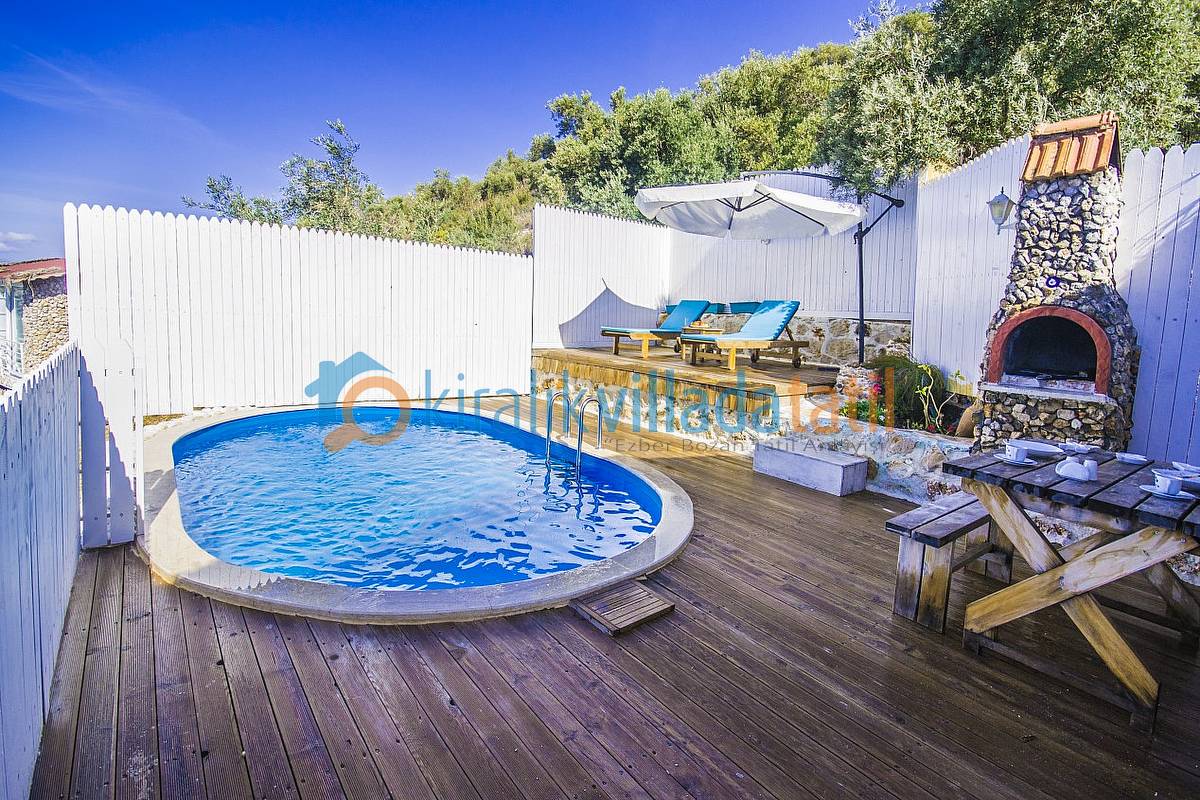 Havuz ebatlarımız 5 metre x 3 metre olup derinlik 1,50 metredir. Havuz terasında 4 kişilik masa, 3 adet şezlong, şemsiye, duş ve taştan barbeküsü bulunmaktadır. Villa içinde küçük bir Amerikan mutfak-bar, ofis tipi buzdolabı, bulaşık makinası, ocak ve çamaşır makinası yer almaktadır. Oturma odası; bir köşe kanepe, sehpa ve LCD Tv’den oluşmaktadır. İnternet bağlantısı ortak olarak sağlanacaktır. Yatak odalarında çift kişilik yatak, 2 komidin, elbise dolabı, makyaj masası ve jakuzi bulunmaktadır.