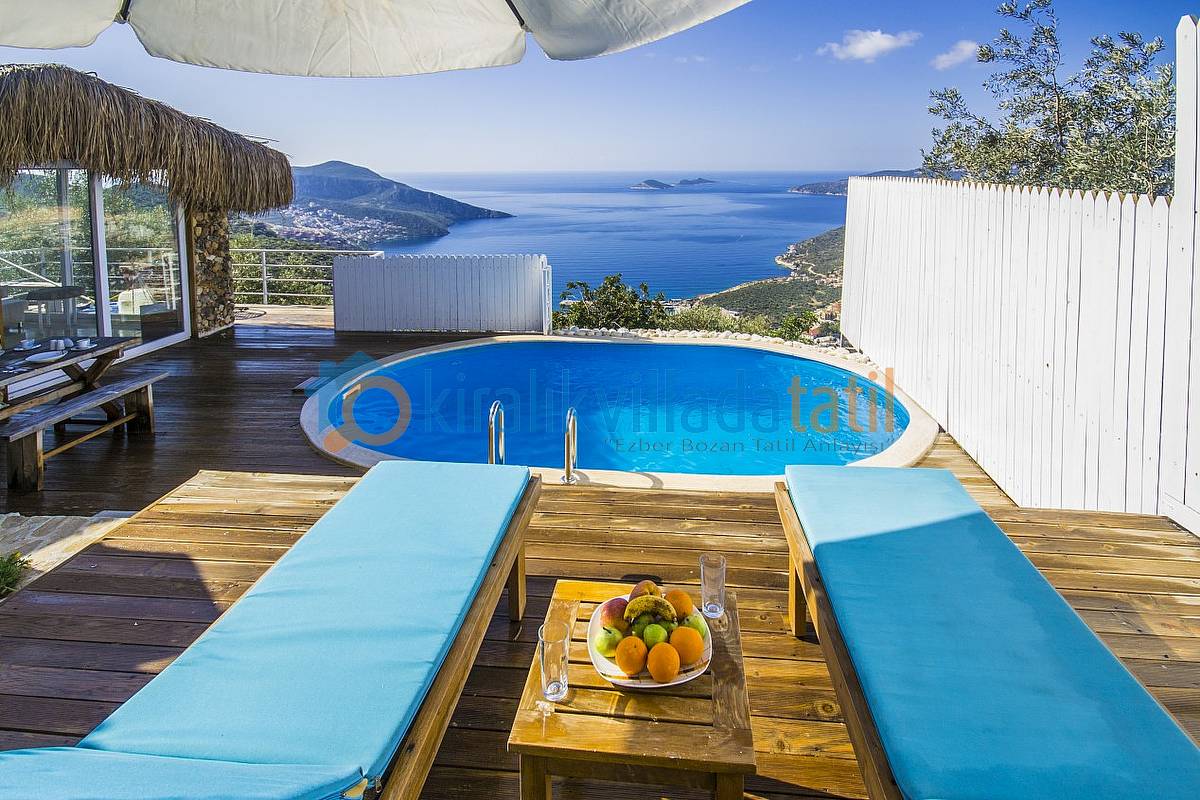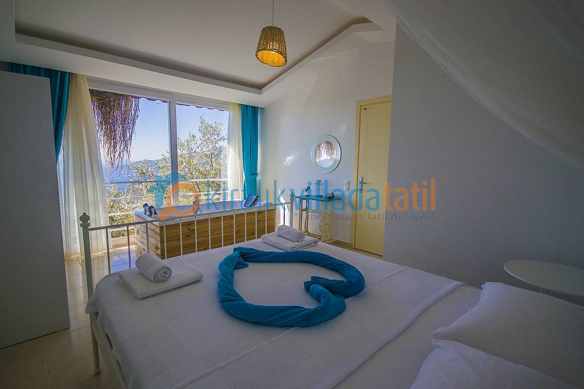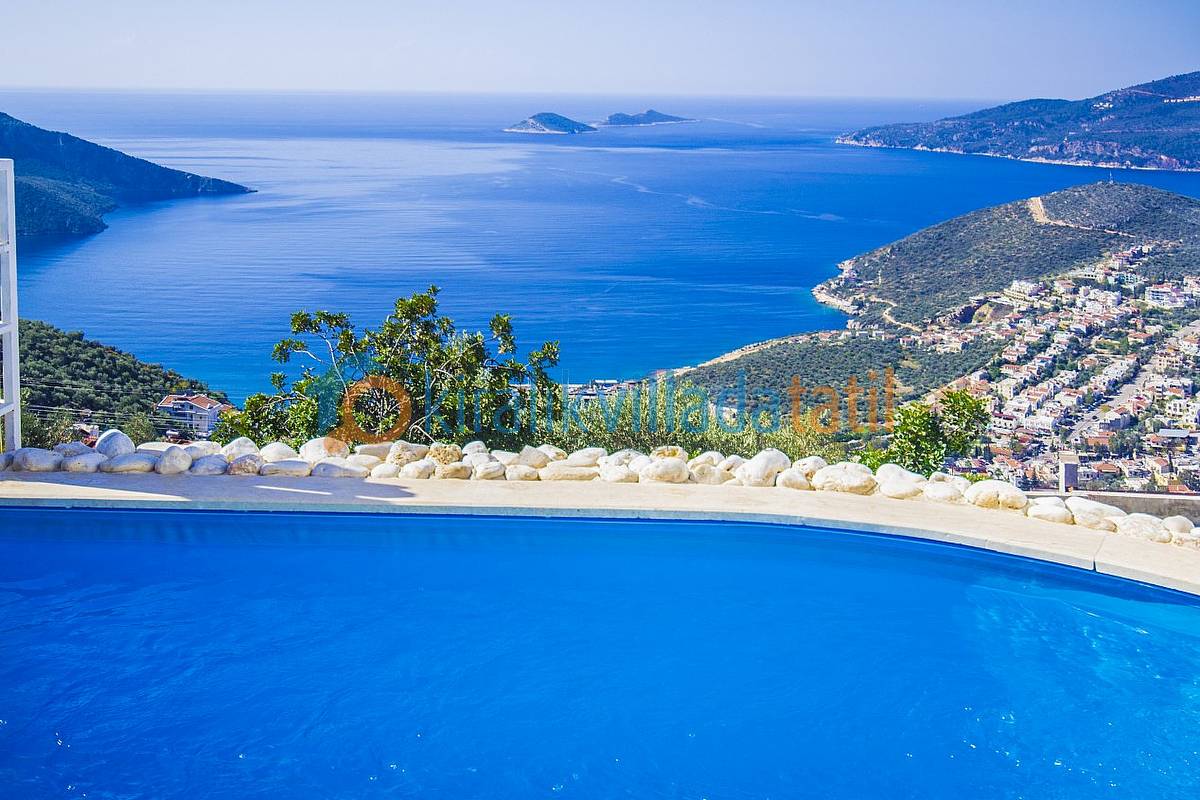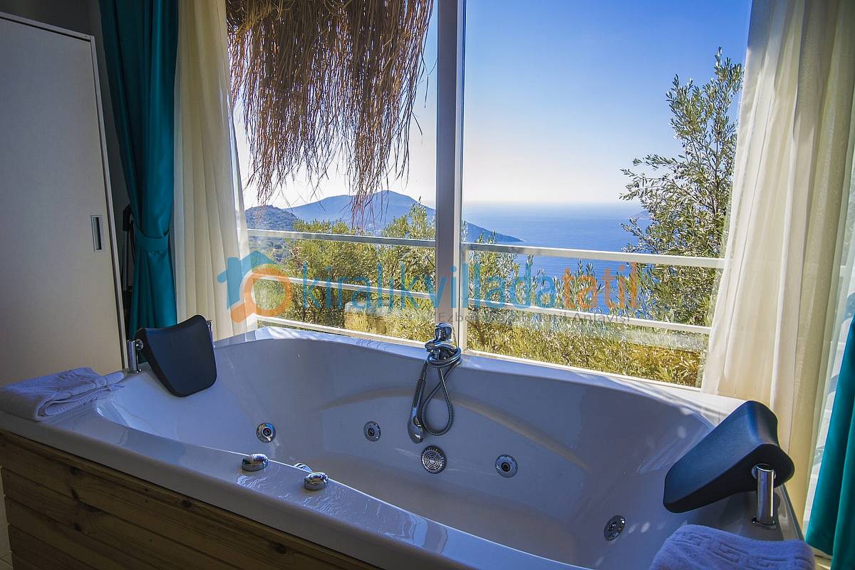 Villamızın bütün odaları ve havuz terası muhteşem Kalkan koyu manzarasına bakmaktadır. Villanın her yerinden bu manzarayı görebilirsiniz. Ayrıca yatak odasında bulunan jakuzimiz de manzarayı görecek şekilde cam önüne yerleştirilmiştir. İki bina birbirini görmeyecek şekilde konumlandırılmıştır. Görünen noktalar olursa hasır ile kapatılmış, muhafazakar ailelerimize ve balayı villası arayan müşterilerimiz için uygun hale getirilmiştir. Villamızın yakın çevresinde herhangi bir yapılaşma yoktur. Zeytin bahçesi içine yapılmış ve Kalkan’ın en yüksek konumdaki villalarından olma özelliğine sahiptir.