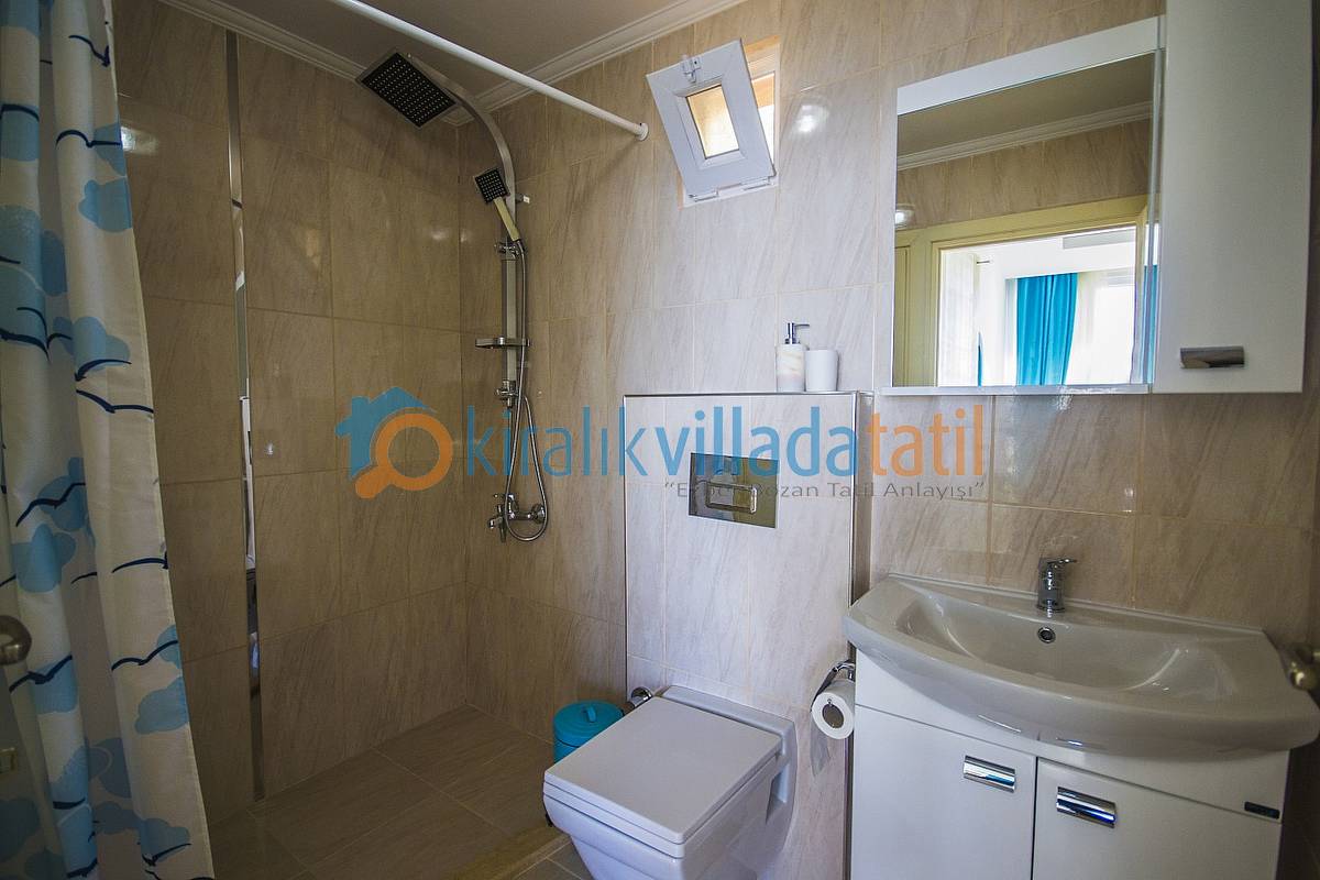 Not: Villamızda toplam 1 adet çift girişli Banyo-Wc bulunmaktadır. Oturma odasından da bir kapı ile banyoya ulaşılmaktadır. (Banyomuz çift girişli olduğundan içerisi dolu iken diğer kapının içeriden kilitlenmesi gerekmektedir.)