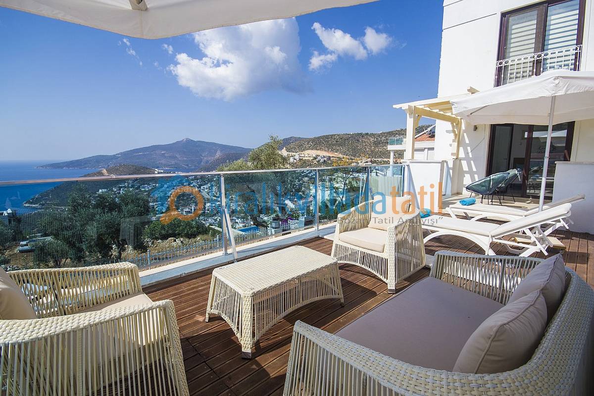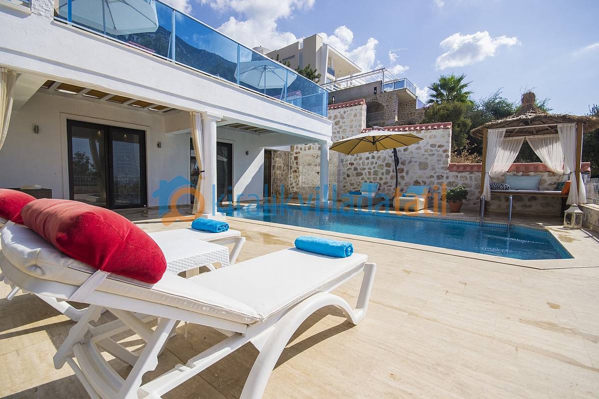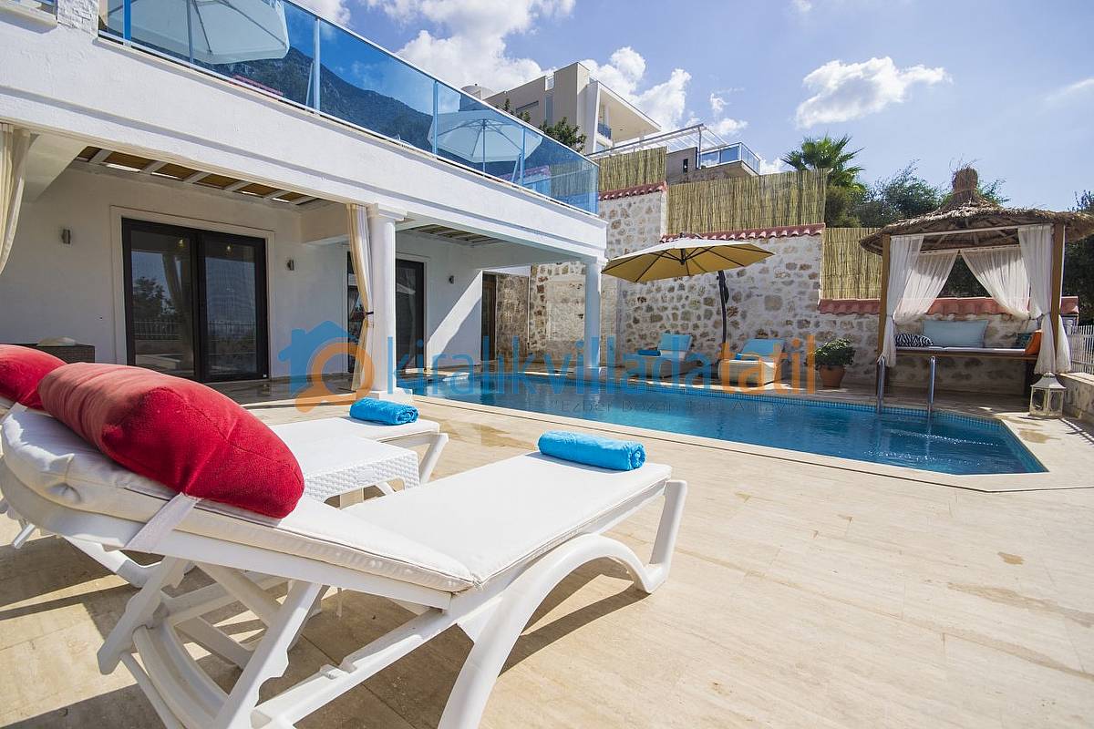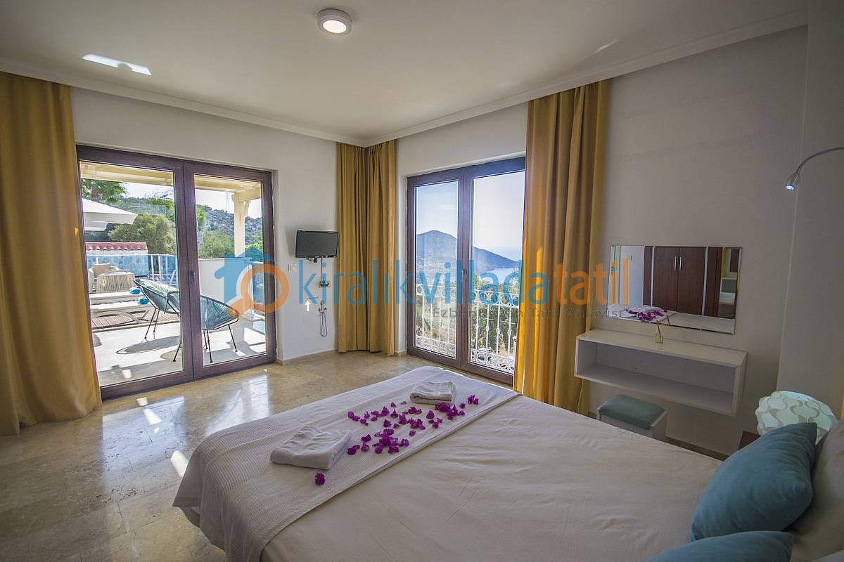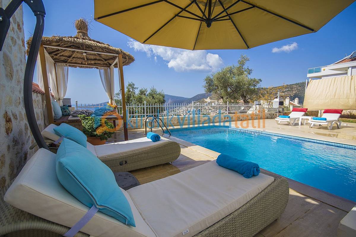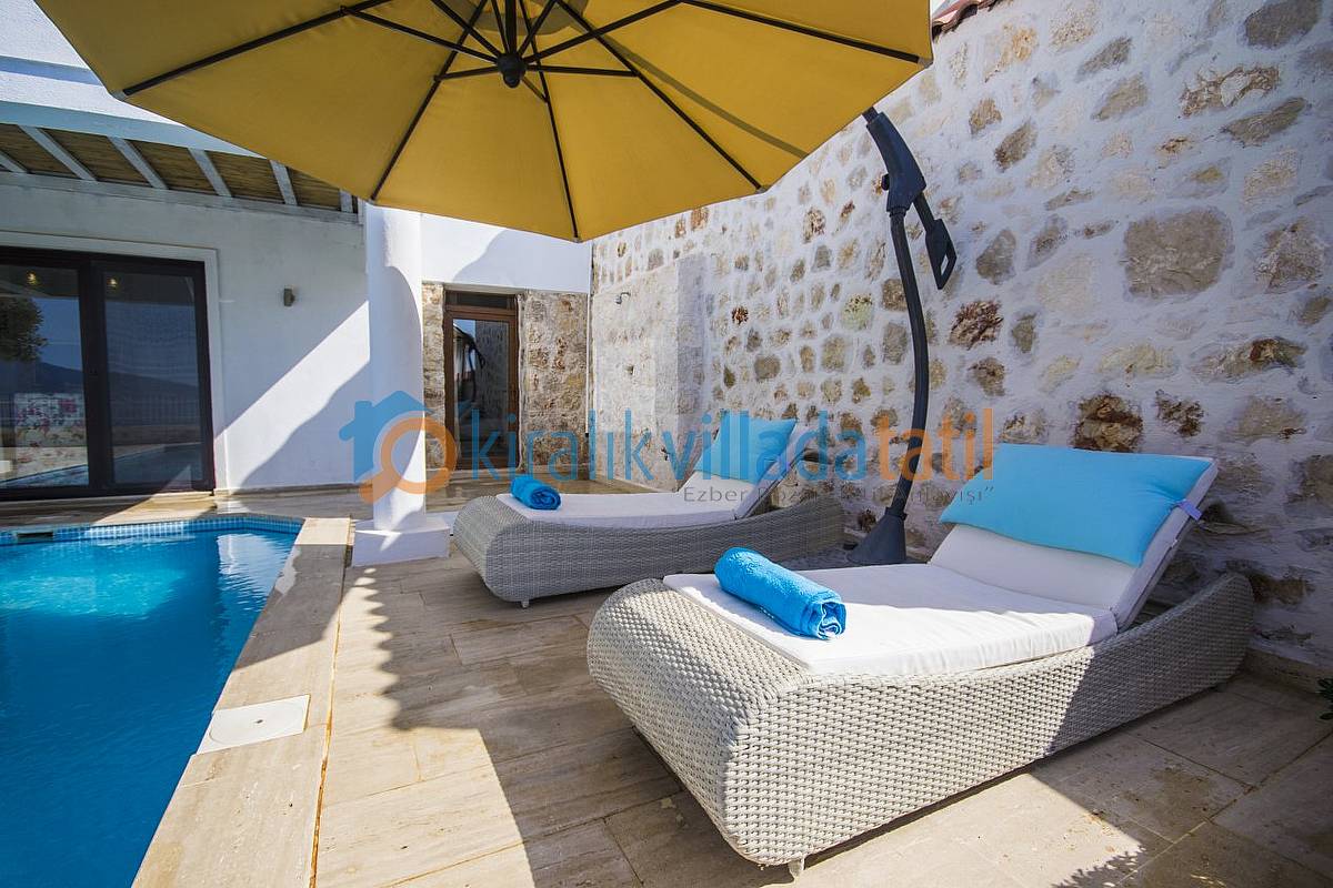 Kalkan şehir merkezine yakın bir konumda olan Kızıltaş mevkiinde bulunan bu lüks tatil villamız, 4 yatak odası ile 7 kişilik kapasiteye sahiptir. Villamızdaki çatı süiti haricindeki diğer odalar ortak banyo wc kullanmaktadır. Toplamda 3 adet banyo WC bulunmaktadır