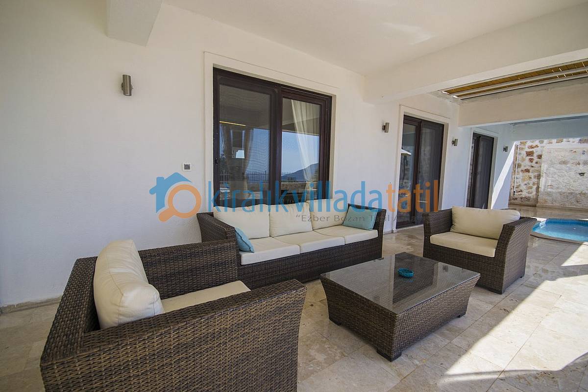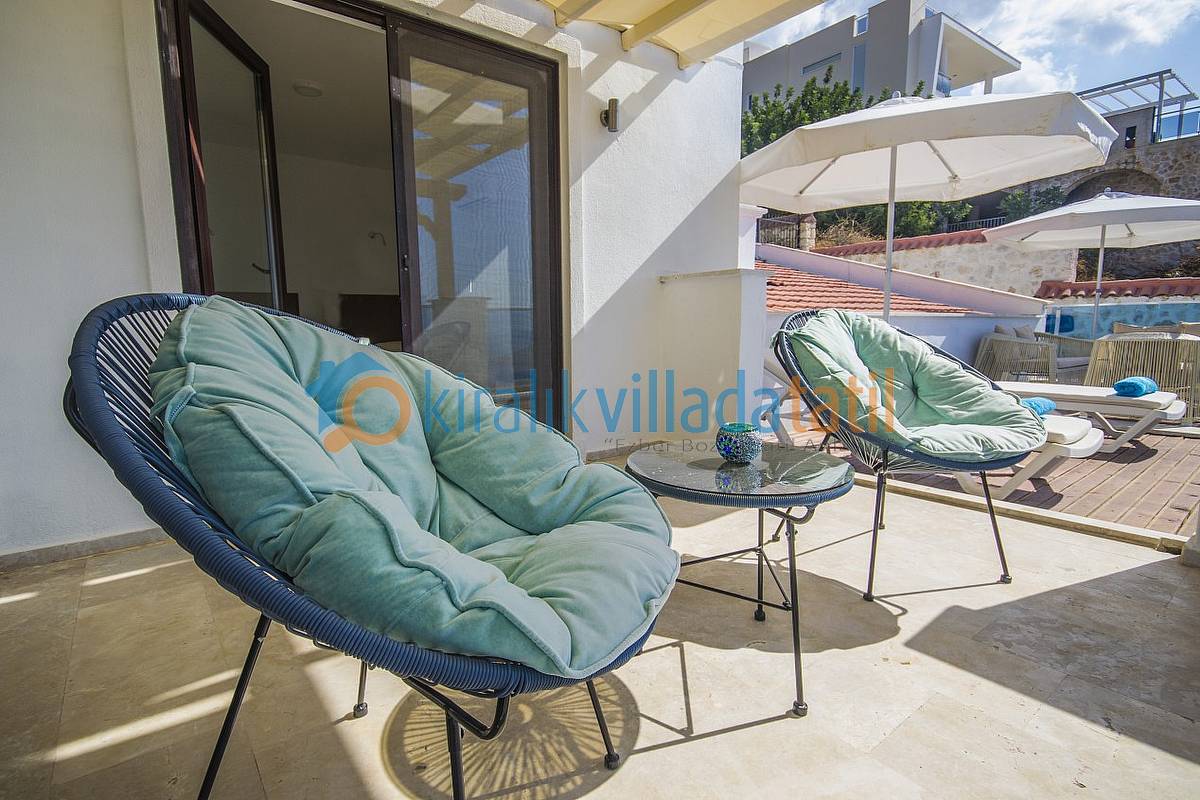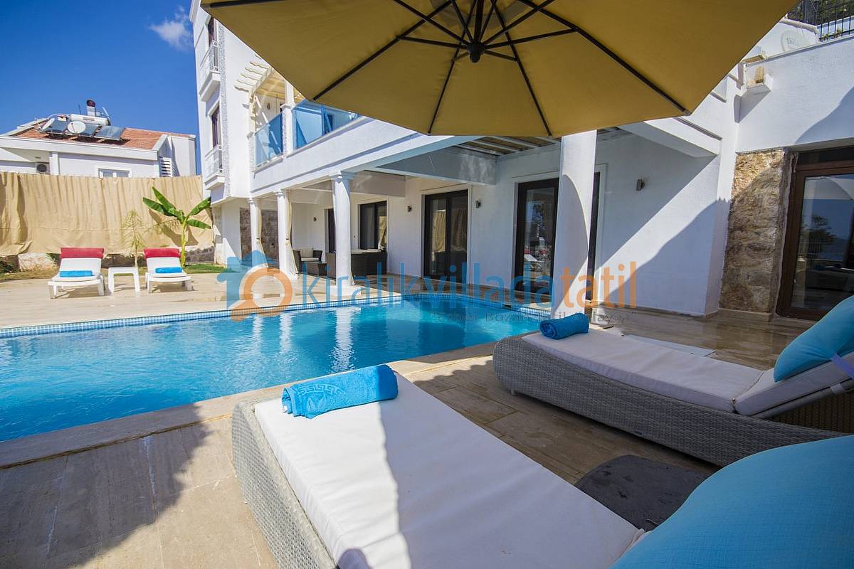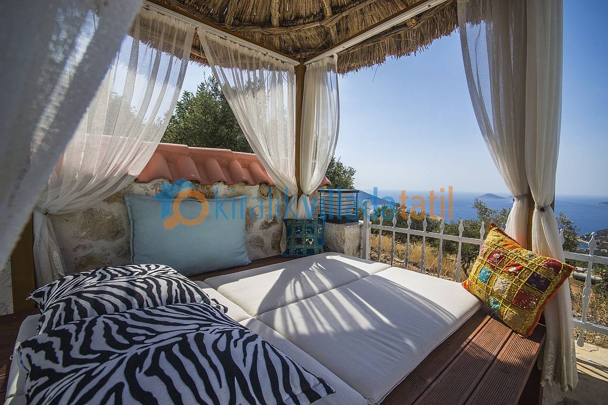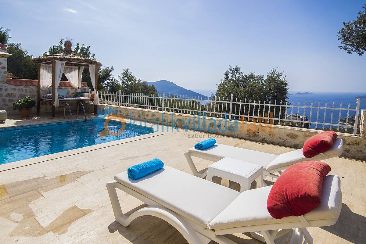 Kalkan şehir merkezine yakın bir konumda olan Kızıltaş mevkiinde bulunan bu lüks tatil villamız, 4 yatak odası ile 7 kişilik kapasiteye sahiptir. Villamızdaki çatı süiti haricindeki diğer odalar ortak banyo wc kullanmaktadır. Toplamda 3 adet banyo WC bulunmaktadır