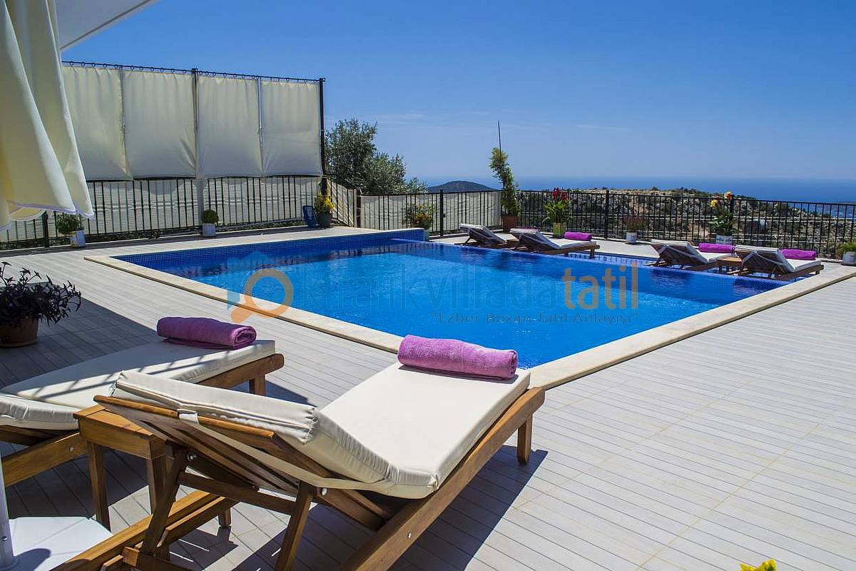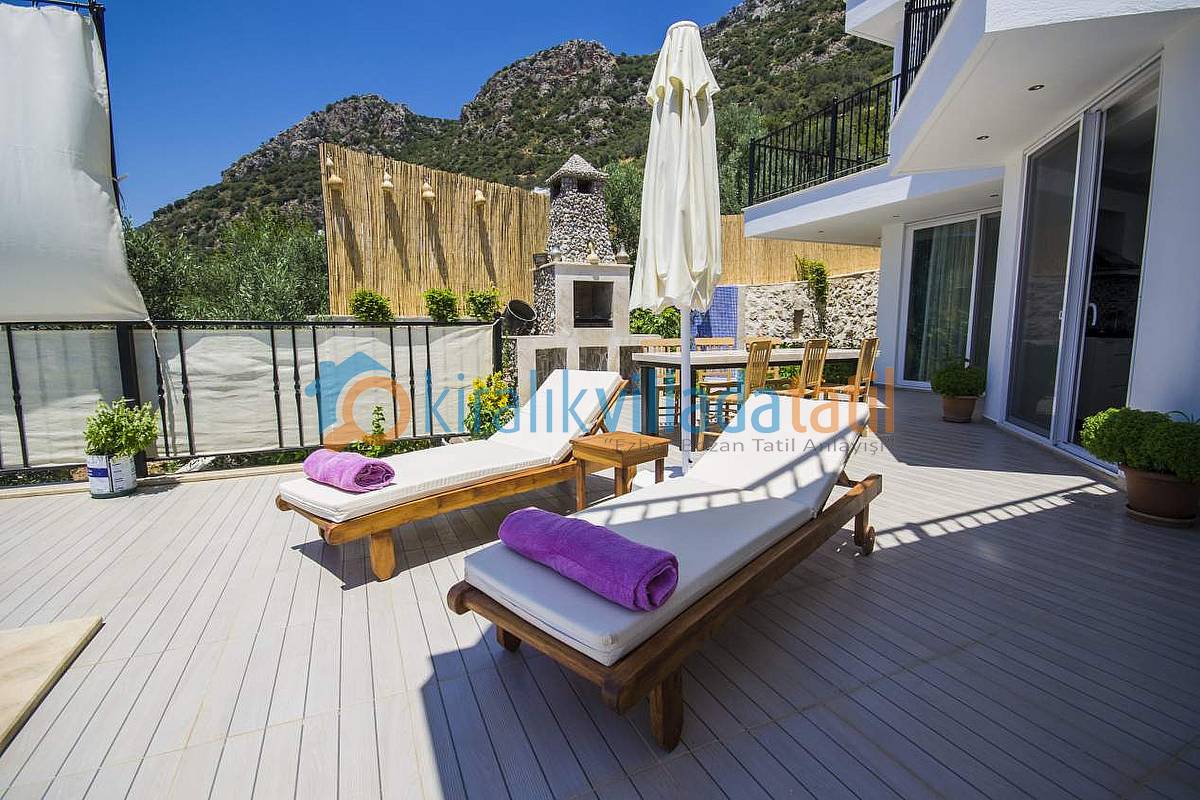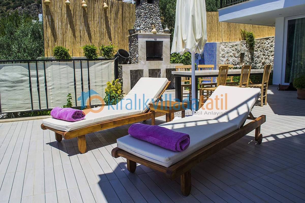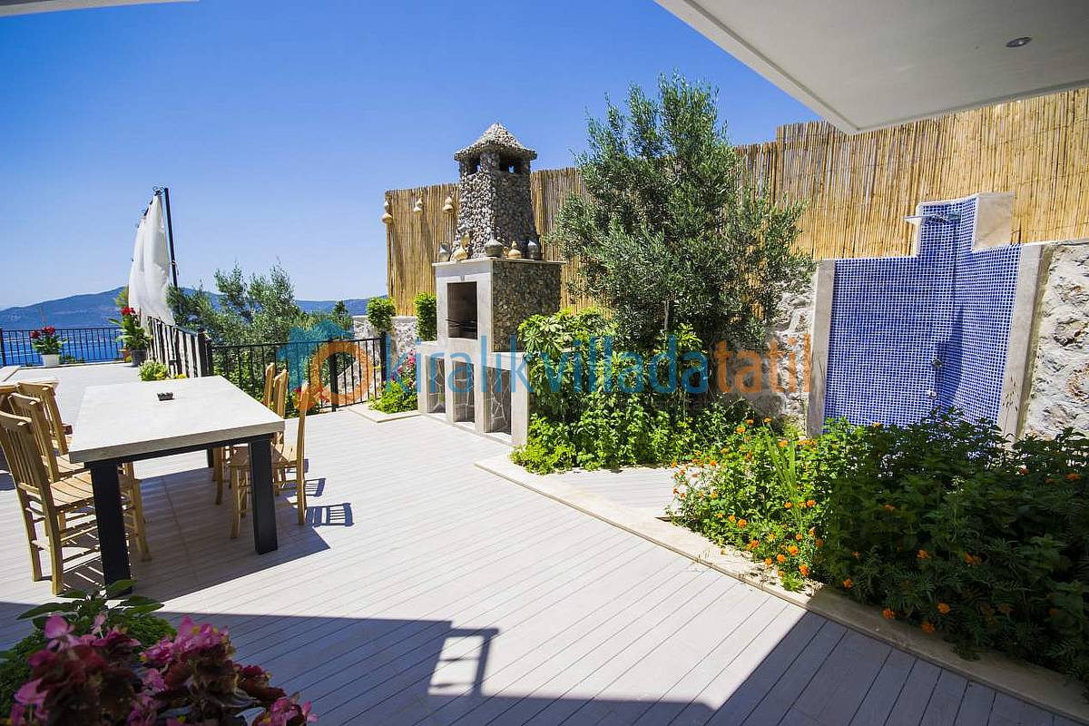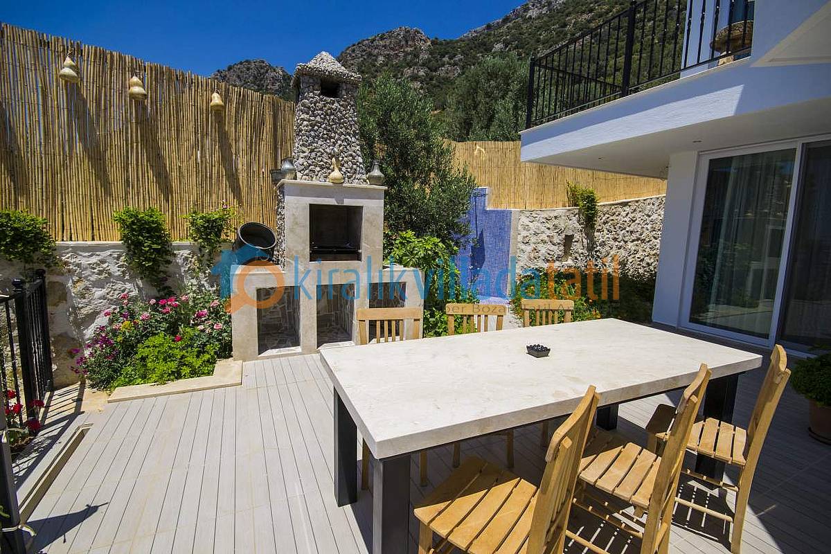 Hemen Mutfak çıkışında, özel yapım taş barbekü ve yemek masasını bulabilirsiniz. Villamızda İnternet bağlantısı, özel açık otopark mevcuttur. Kalkan Şehir merkezine 3-3,5 km olan villamız yaklaşık 5 dakikalık sürüş mesafesi ile merkeze yakın konumdadır. Muhteşem Kalkan koyu manzarası, Geniş yüzme havuzu, geniş sığ havuzu, terasları ve kullanım alanları ile konuklarına ferah bir tatil imkanı sağlamaktadır. Düşük sezonlarda Balayı yapacak müşterilerimiz için merkeze yakın konumda olması sıcaklık açısından büyük bir avantajdır. Villamızın çok yakın çevresinde yapılaşma olmadığından Balayı çiftlerimiz için çok uygun bir villadır. Villamızın sağ ve sol tarafı tamamen perde hasır vs… ile korunaklı hale getirilmiştir. Havuz terasının korkuluk demirlerinin içleri de kumaş ile kapatılmıştır.