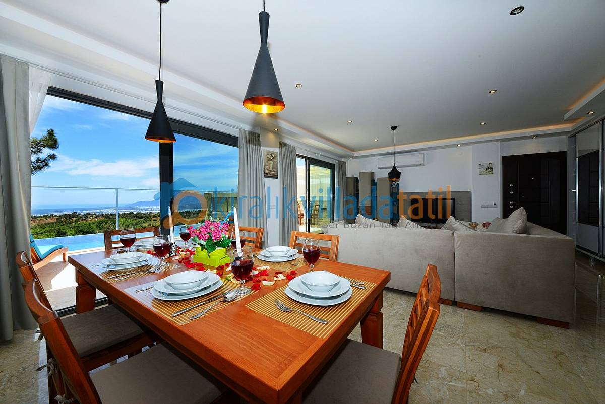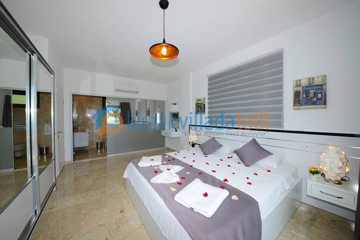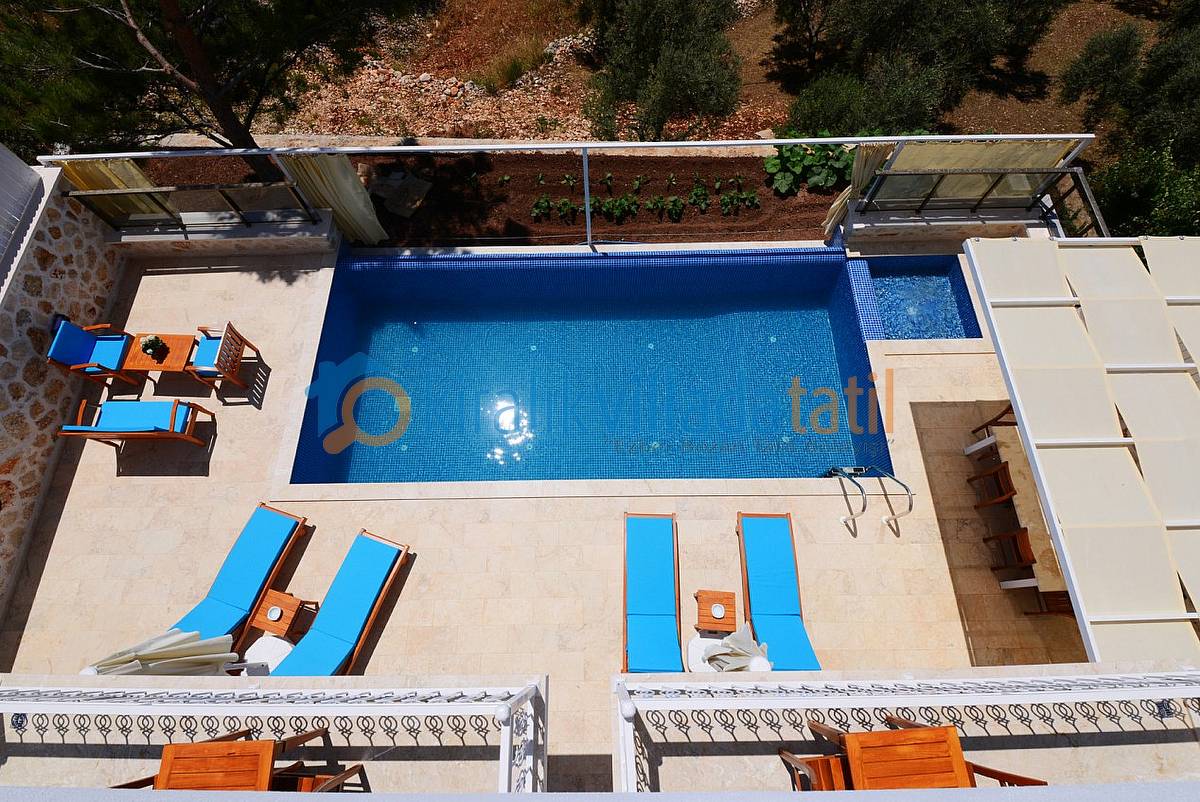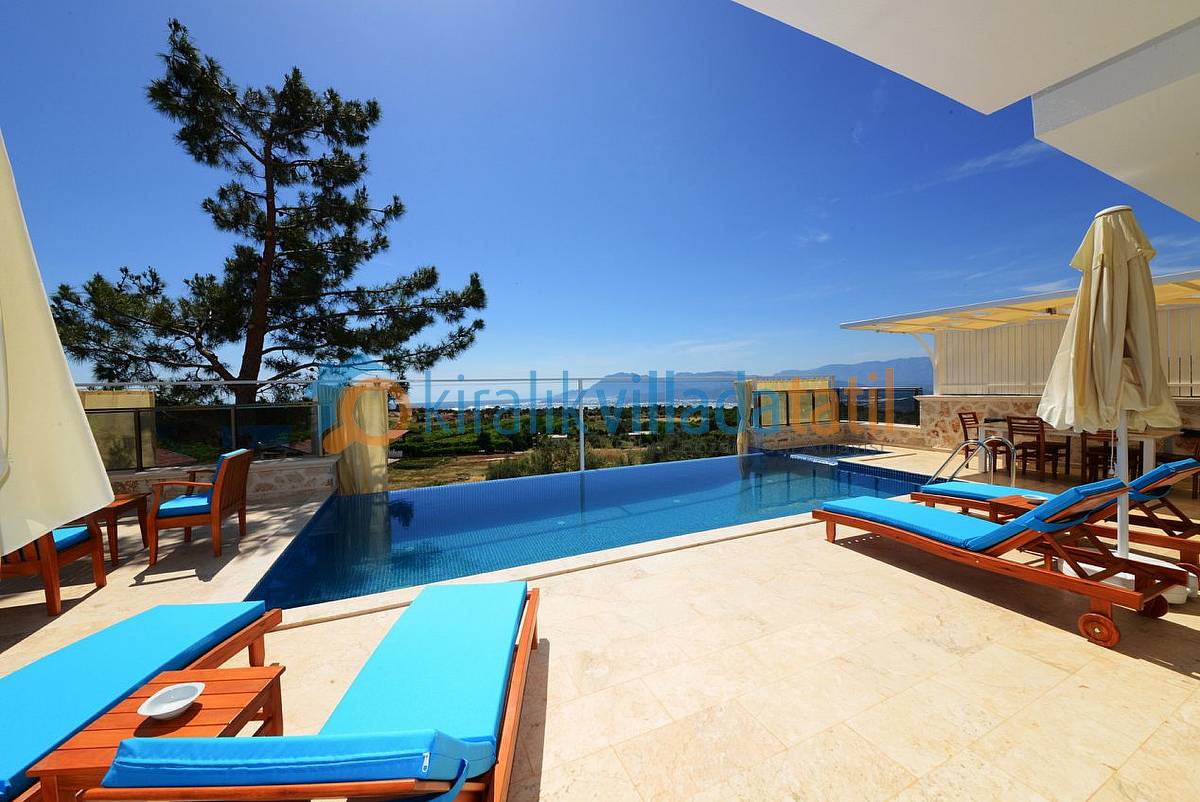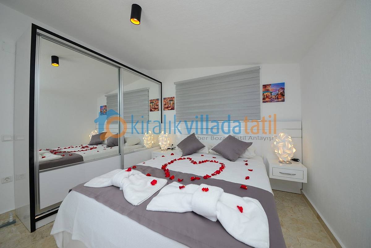 Muhteşem Patara Manzarasına hakim bir tepe üzerindeki konumu ve Modern iç dizaynı ile ön plana çıkan villamıza, anayoldan sonra yaklaşık 100 metrelik bir yoldan gidilmektedir. Kalkan şehir merkezine yaklaşık 7 km mesafede, günlük ihtiyaçlarınız için en yakın köy meydanı ise (üzümlü köyü) 1 km mesafededir. Araç genel olarak gereklidir. Etrafında tamamı korunaklı olmak üzere başka villalar da mevcuttur. Tamamen doğa içinde full deniz ve doğa manzaralı bir konuma sahiptir. Villamızda tatiliniz için gerekli her şey mevcuttur. İnternet bağlantısı, jakuzi ve çocuk havuzu bulunmaktadır. 1.katta bir adet çift kişilik ebeveyn yatak odası (banyolu) ve genç yatak odası bulunmaktadır. Çatı süitinde ise yine bir adet çift kişilik ebeveyn yatak odası (banyolu ve jakuzili) bulunmakta, teras katta 2 adet şezlong ve oturma grubu bulunmaktadır.