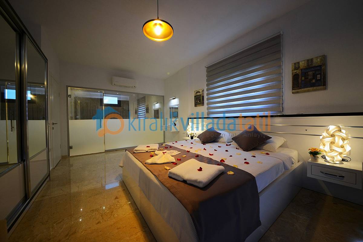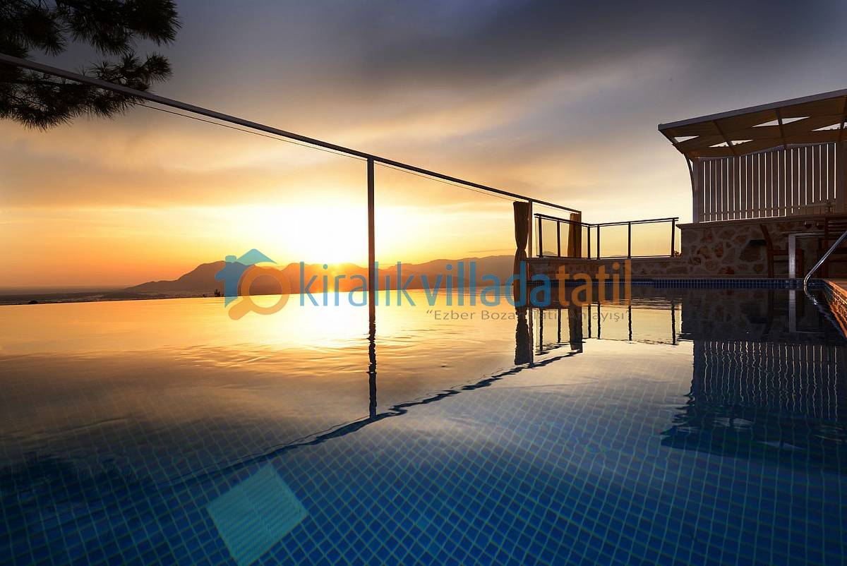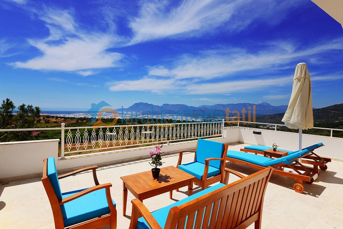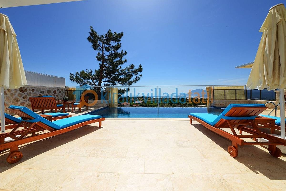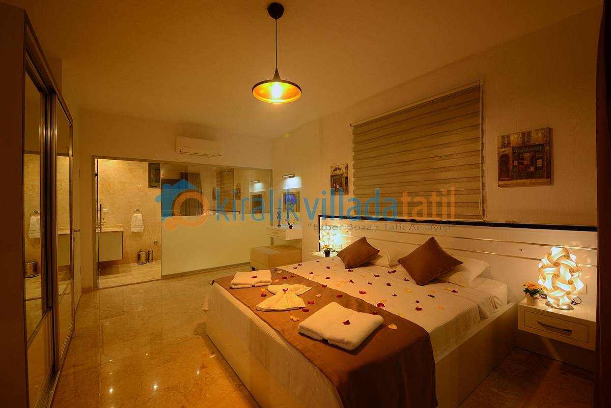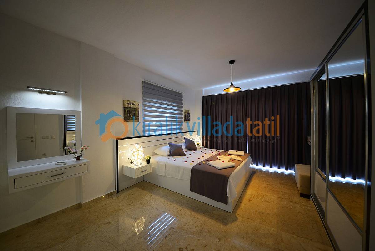 Muhteşem Patara Manzarasına hakim bir tepe üzerindeki konumu ve Modern iç dizaynı ile ön plana çıkan villamıza, anayoldan sonra yaklaşık 100 metrelik bir yoldan gidilmektedir. Kalkan şehir merkezine yaklaşık 7 km mesafede, günlük ihtiyaçlarınız için en yakın köy meydanı ise (üzümlü köyü) 1 km mesafededir. Araç genel olarak gereklidir. Etrafında tamamı korunaklı olmak üzere başka villalar da mevcuttur. Tamamen doğa içinde full deniz ve doğa manzaralı bir konuma sahiptir. Villamızda tatiliniz için gerekli her şey mevcuttur. İnternet bağlantısı, jakuzi ve çocuk havuzu bulunmaktadır. 1.katta bir adet çift kişilik ebeveyn yatak odası (banyolu) ve genç yatak odası bulunmaktadır. Çatı süitinde ise yine bir adet çift kişilik ebeveyn yatak odası (banyolu ve jakuzili) bulunmakta, teras katta 2 adet şezlong ve oturma grubu bulunmaktadır.