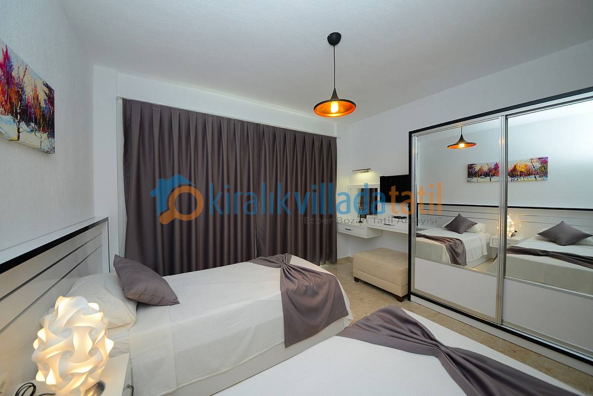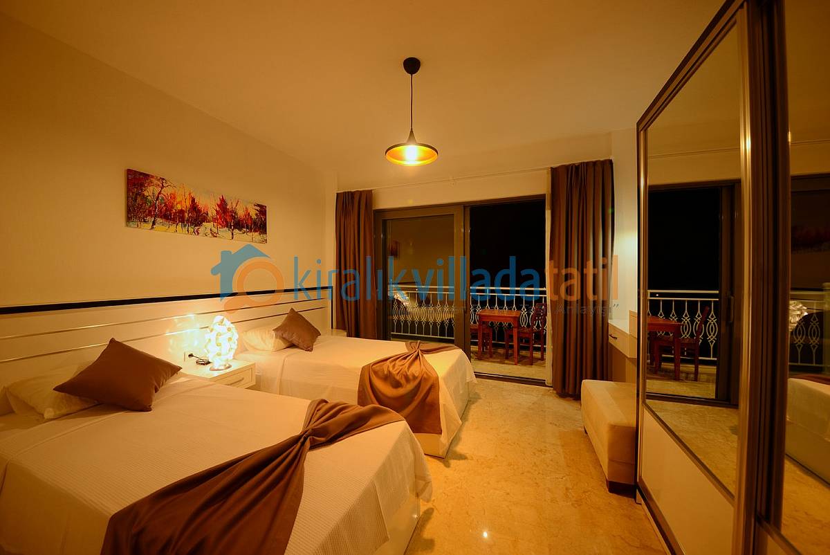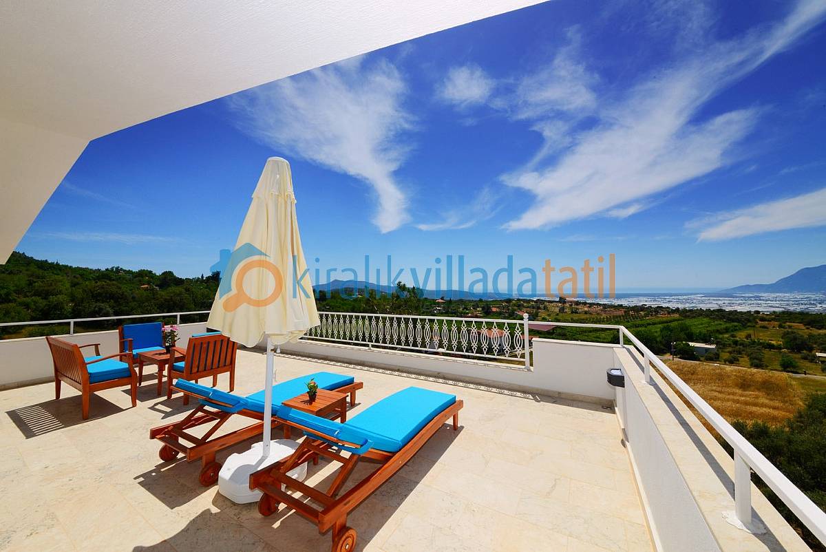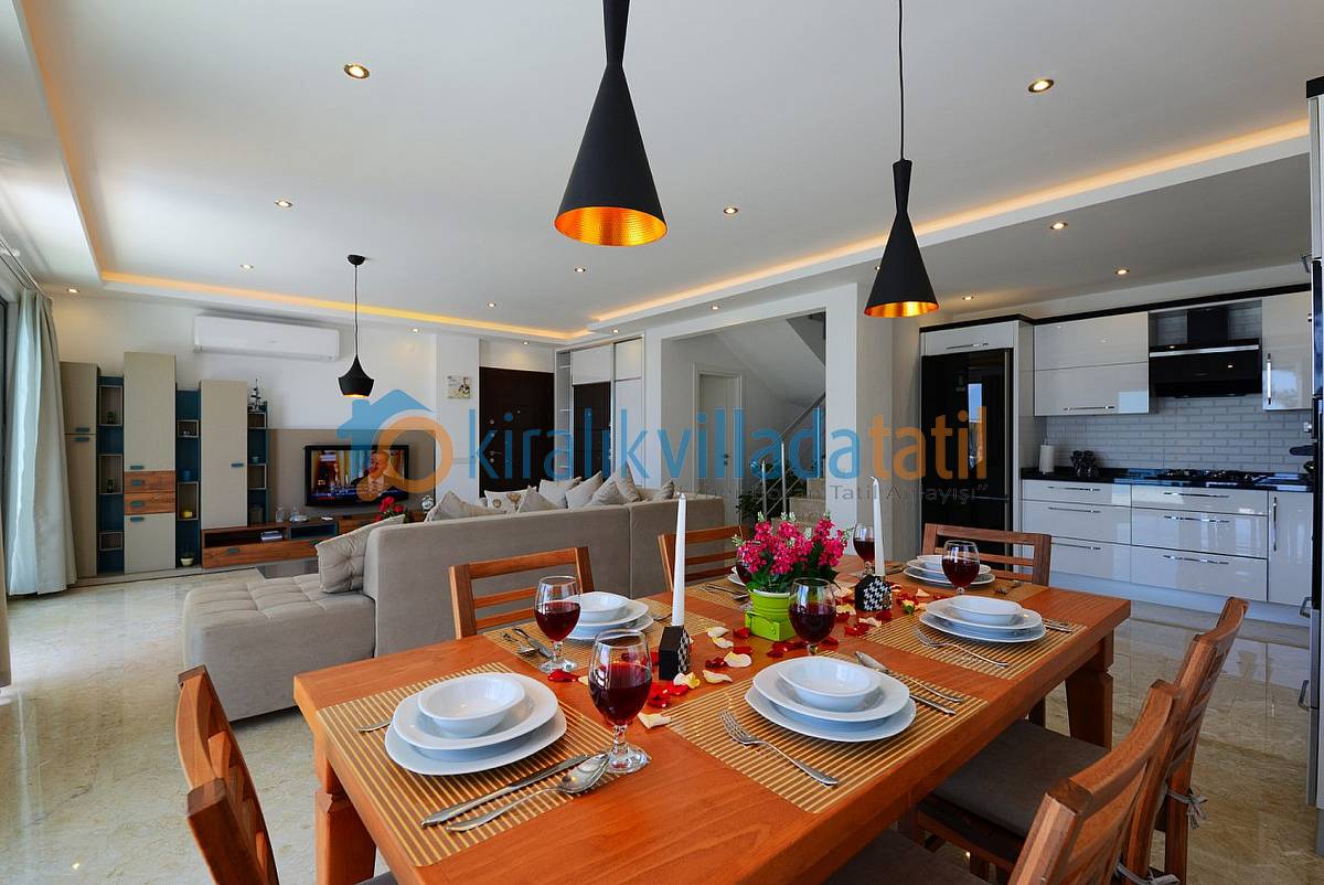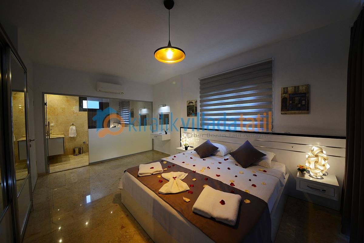 Muhteşem Patara Manzarasına hakim bir tepe üzerindeki konumu ve Modern iç dizaynı ile ön plana çıkan villamıza, anayoldan sonra yaklaşık 100 metrelik bir yoldan gidilmektedir. Kalkan şehir merkezine yaklaşık 7 km mesafede, günlük ihtiyaçlarınız için en yakın köy meydanı ise (üzümlü köyü) 1 km mesafededir. Araç genel olarak gereklidir. Etrafında tamamı korunaklı olmak üzere başka villalar da mevcuttur. Tamamen doğa içinde full deniz ve doğa manzaralı bir konuma sahiptir. Villamızda tatiliniz için gerekli her şey mevcuttur. İnternet bağlantısı, jakuzi ve çocuk havuzu bulunmaktadır. 1.katta bir adet çift kişilik ebeveyn yatak odası (banyolu) ve genç yatak odası bulunmaktadır. Çatı süitinde ise yine bir adet çift kişilik ebeveyn yatak odası (banyolu ve jakuzili) bulunmakta, teras katta 2 adet şezlong ve oturma grubu bulunmaktadır.