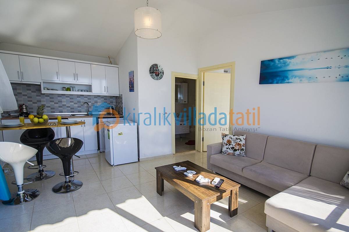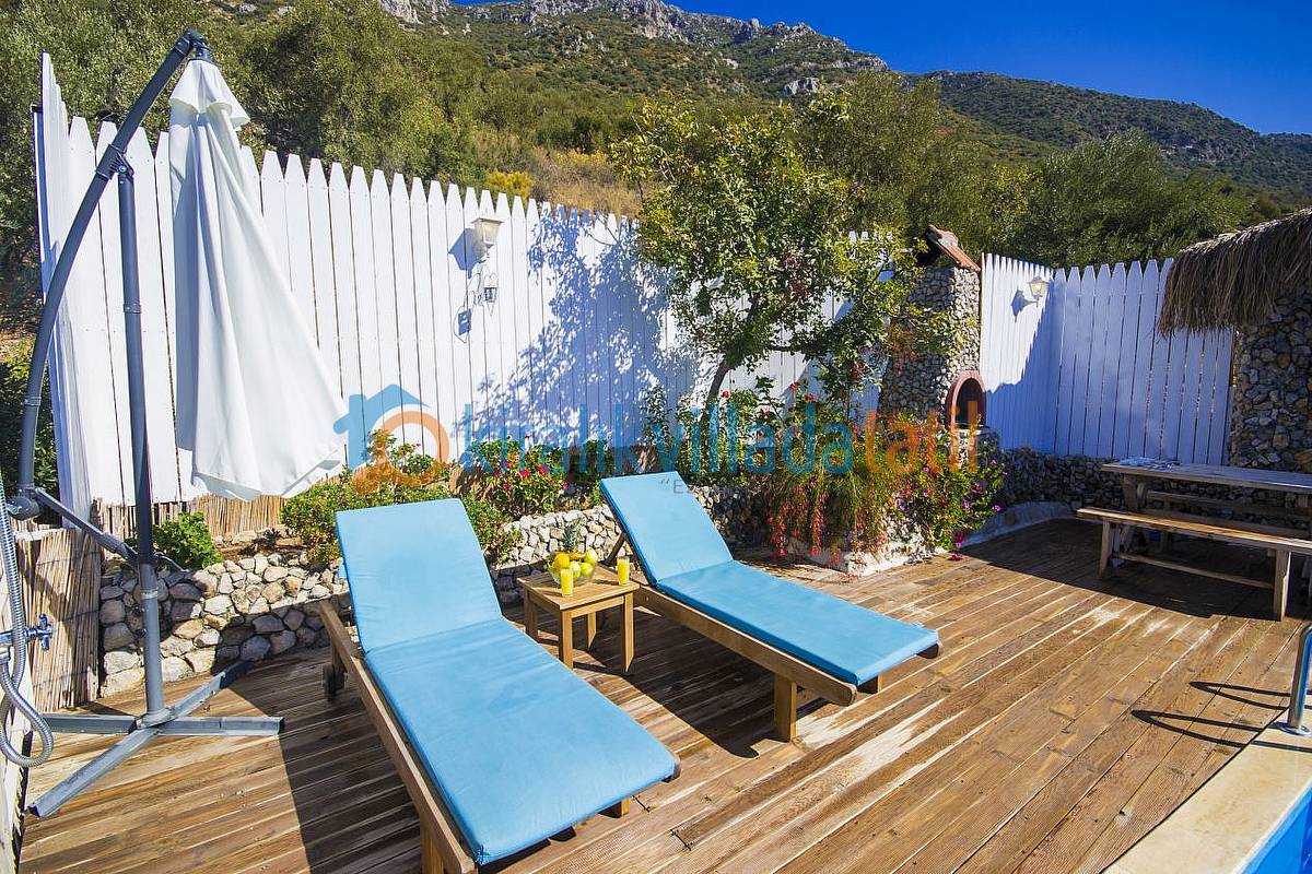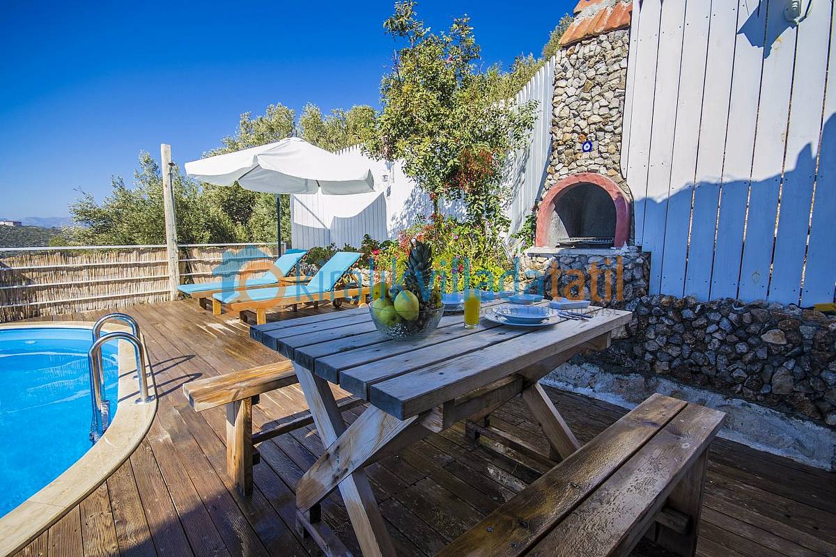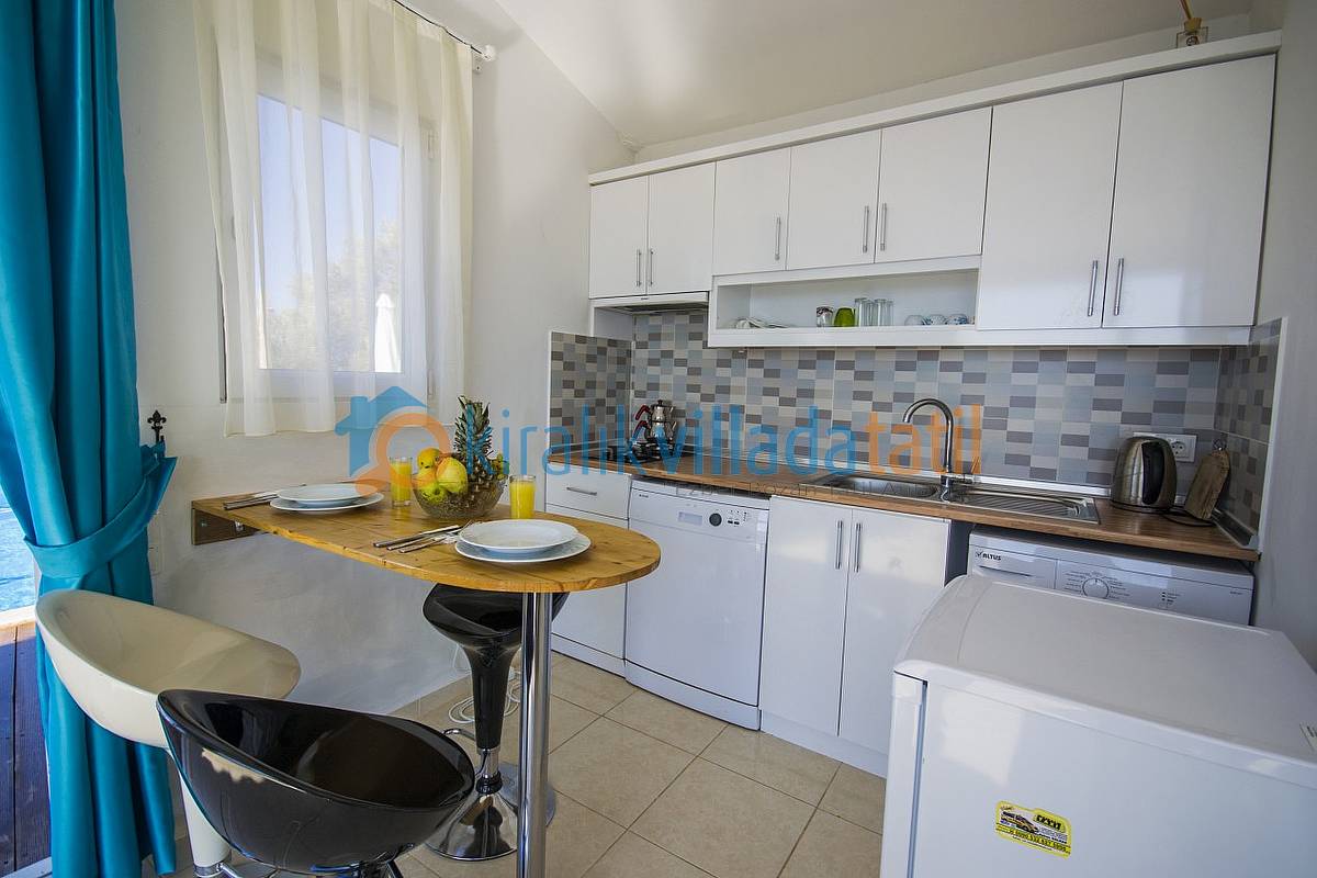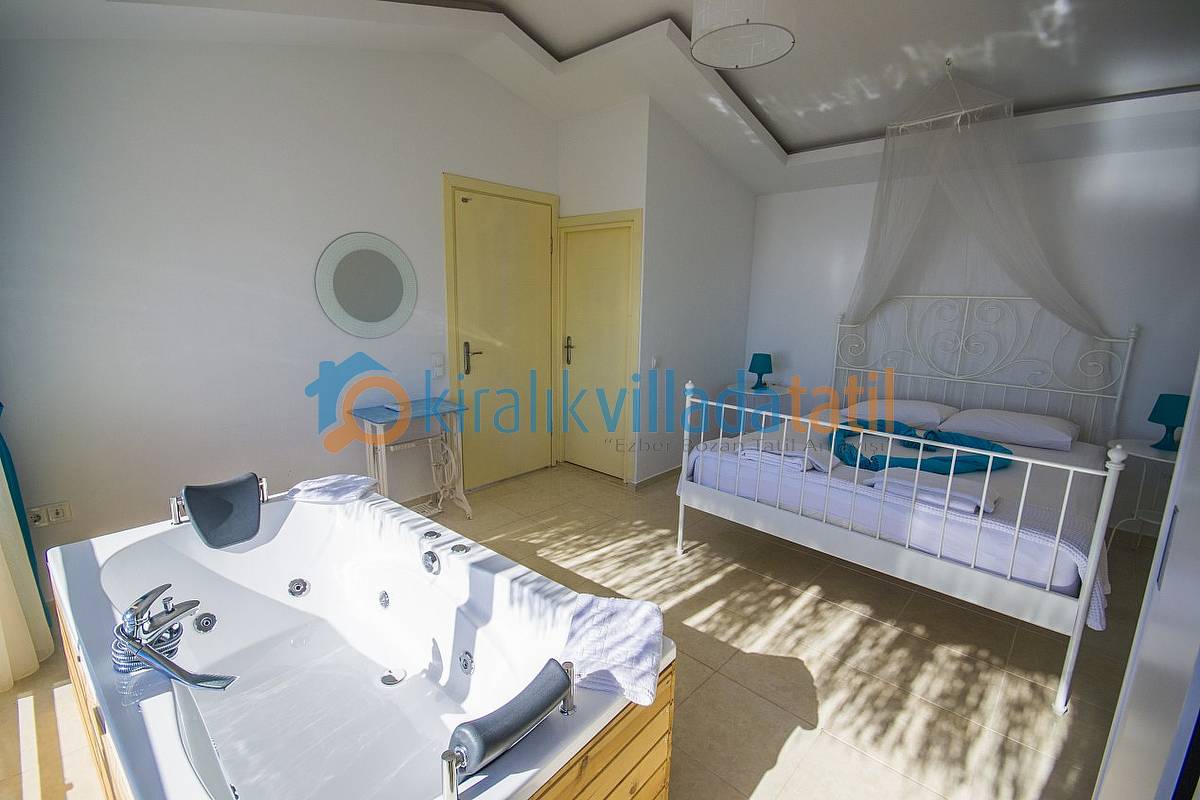 Havuz ebatlarımız 5 metre x 3 metre olup derinlik 1,50 metredir. Havuz terasında 4 kişilik masa, 3 adet şezlong, şemsiye, duş ve taştan barbeküsü mevcuttur. Villa içinde küçük bir Amerikan mutfak-bar, ofis tipi buzdolabı, bulaşık makinası, ocak ve çamaşır makinası yer almaktadır. Oturma odası; bir köşe kanepe, sehpa ve LCD Tv’den oluşmaktadır. İnternet bağlantısı ortak olarak sağlanacaktır. Yatak odalarında çift kişilik yatak, 2 komidin, elbise dolabı, makyaj masası ve jakuzi bulunmaktadır.
