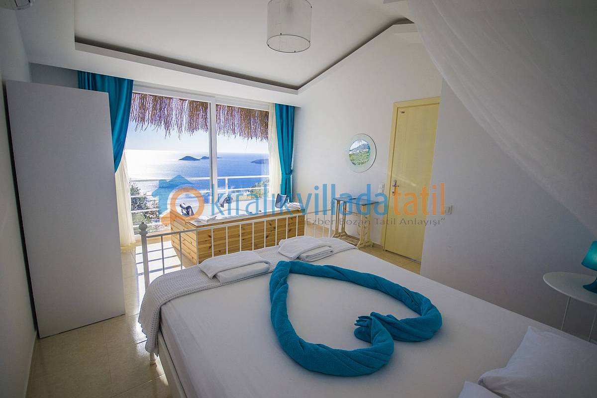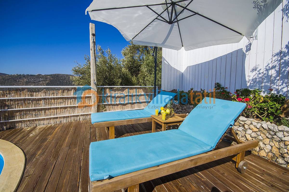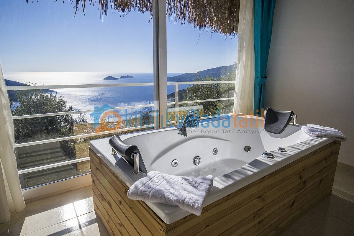 Villamızın bütün odaları ve havuz terası muhteşem Kalkan koyu manzarasına bakmaktadır. Villanın her yerinden bu manzarayı görebilirsiniz. Ayrıca yatak odasında bulunan jakuzimiz de manzarayı görecek şekilde cam önüne yerleştirilmiştir. İki bina birbirini görmeyecek şekilde konumlandırılmıştır. Ancak görünecek noktalar olursa hasır, perde vs… yöntemler ile görünmezlik sağlanmış ve muhafazakar ailelerimize ve balayı villa konsepti arayan müşterilerimiz için uygun hale getirilmiştir. Villamızın yakın çevresinde herhangi bir yapılaşma yoktur. Zeytin bahçesi içine yapılmış ve Kalkan’ın en yüksek konumdaki villalarından olma özelliğine sahiptir.